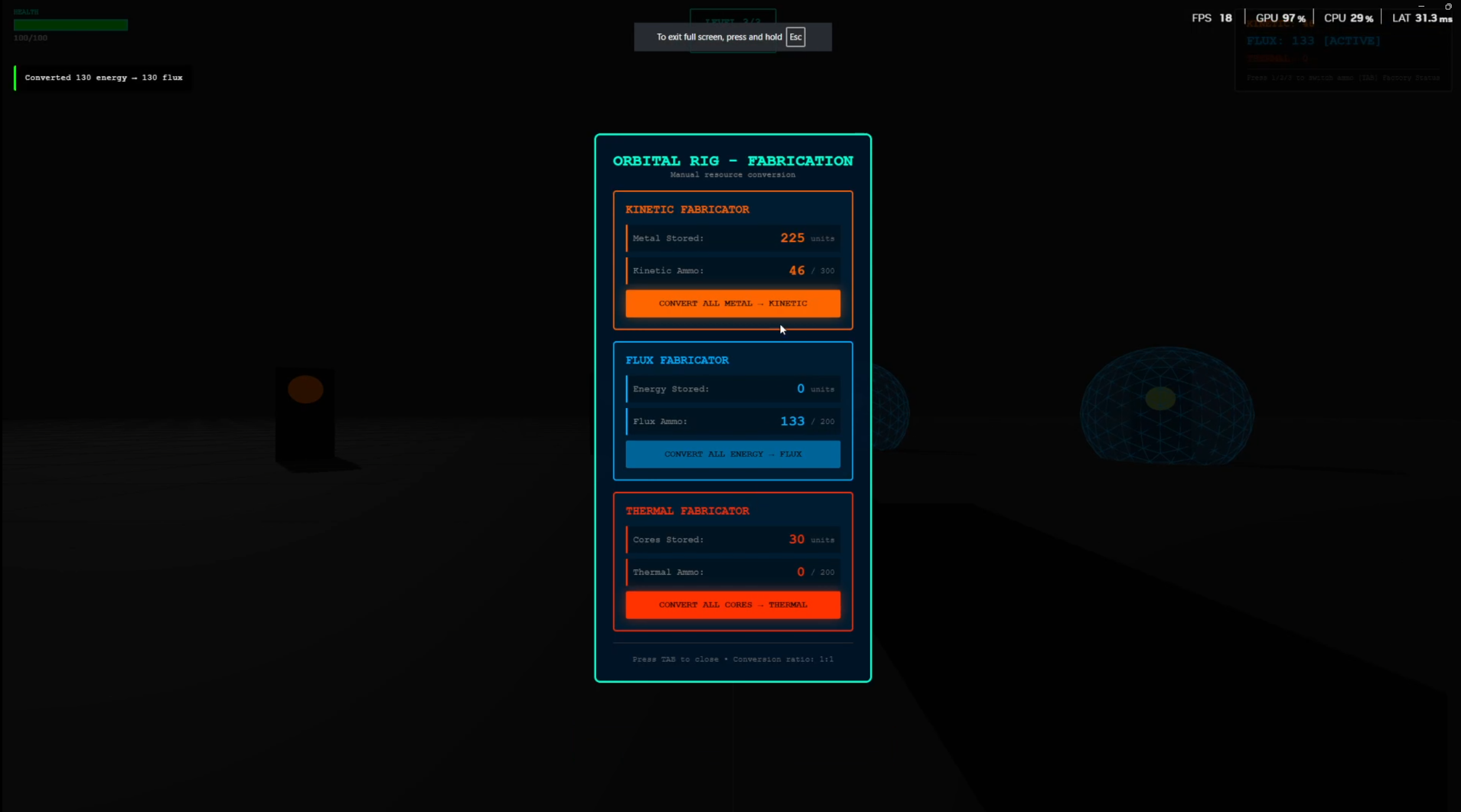 Resources don't auto-convert. You decide when to forge. Press TAB mid-combat to access your orbital fabricator and convert stockpiled materials into the ammo you need. Forge proactively during lulls, or panic-craft when you're running dry. Strategic resource management meets real-time FPS action.